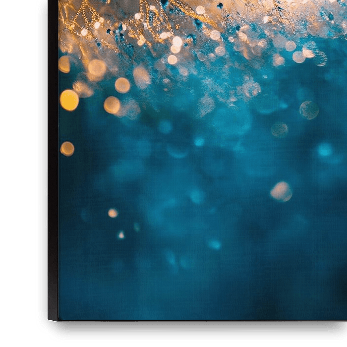 Ein faszinierendes Spiel aus leuchtenden, goldenen und blauen Funken, das an einen nächtlichen Sternenhimmel erinnert. Die harmonische Verbindung von Licht und Farbe schafft eine träumerische Atmosphäre, die zum Verweilen einlädt. Ideal für das Schlafzimmer, fördert es Entspannung und Inspiration. Perfekt für eine Wand, die zum Träumen…