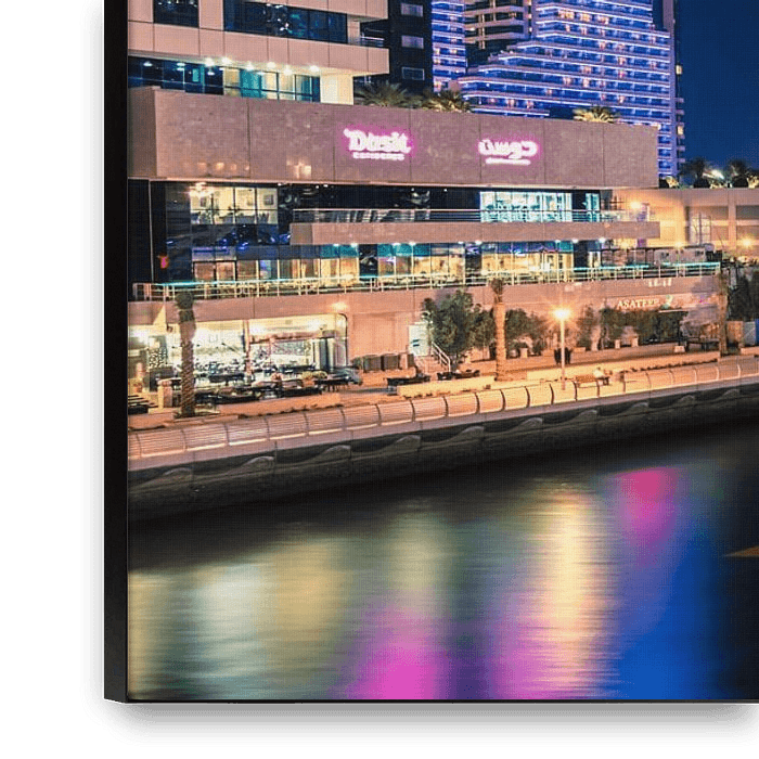 Die Dubai Marina bei Nacht. Es hat ein futuristisches Aussehen und Gefühl. Es ist nach wie vor eine der schönsten Gegenden Dubais, vor allem am Abend und in der Nacht.