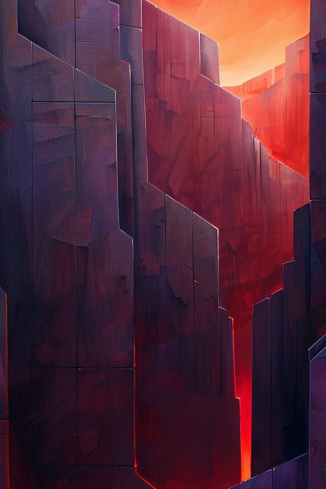 Dieses atemberaubende Design zeigt eine futuristische Schlucht, die von den feurigen Farben der untergehenden Sonne beleuchtet wird. Die scharfen, geometrischen Linien der Schlucht kontrastieren wunderschön mit dem glühenden Himmel und schaffen eine dynamische und fesselnde Szene. Dieses Kunstwerk eignet sich perfekt für moderne Innenräume und ist ein auffälliger Blickfang in jedem Raum, vom eleganten Büro bis zum gemütlichen Schlafzimmer. Die Verwendung intensiver Farben und abstrakter Formen verleiht dem Werk ein einzigartiges und modernes Aussehen, das sowohl fasziniert als auch inspiriert. Verleihen Sie Ihrer Einrichtung einen Hauch von Futurismus und Energie mit diesem schönen Kunstwerk.