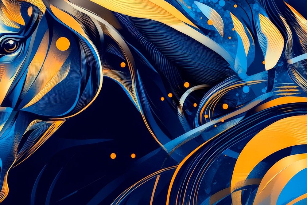 In einem dynamischen Spiel von Blau und Gold entfaltet sich die majestätische Anmut eines Pferdes, dessen Energie förmlich spürbar ist. Die fließenden Linien und lebendigen Farben verleihen dem Raum eine lebhafte Atmosphäre, ideal für das Wohnzimmer. Hier wird jeder Blick zu einem Moment voller Inspiration und Bewegung, der zum Träumen einlädt.