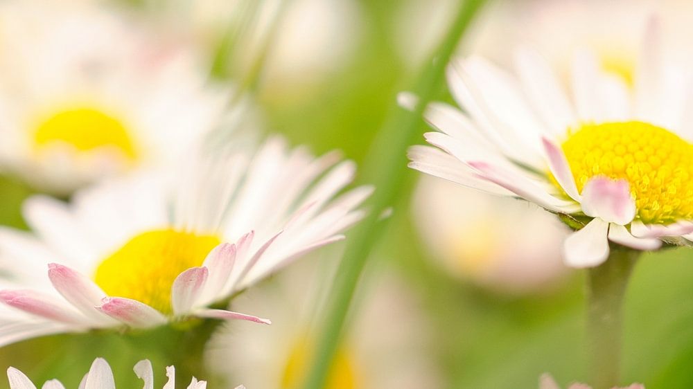 Gänseblümchen auf einer grünen Wiese. Weiß rosa Blüten mit grünen Blättern. Frühsommer Blumen.