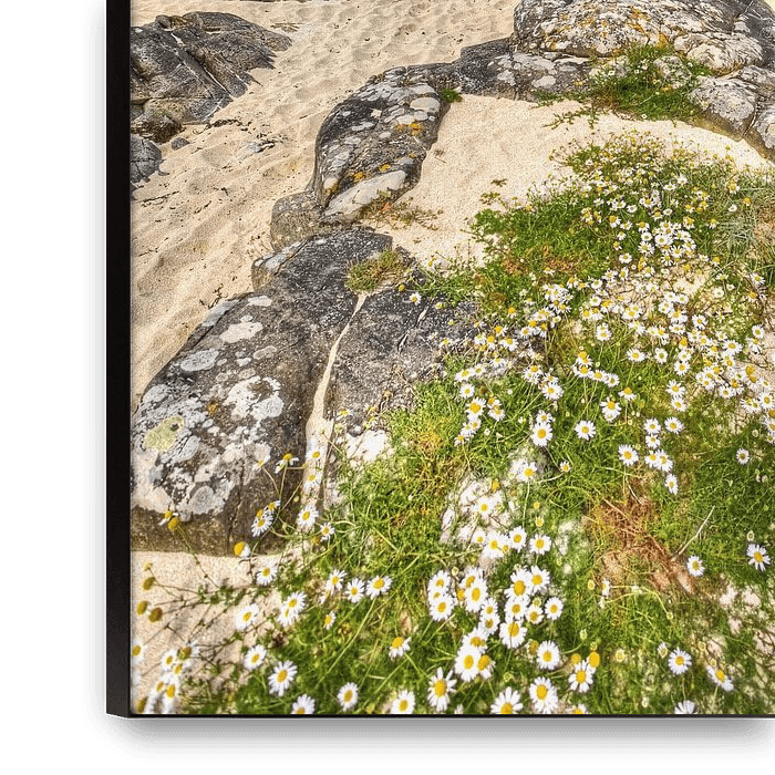 Bestelle dieses Blumen-Wandbild Gänseblümchen gegen Felsen bei Galway Bay, Irland von Hans Kwaspen als Reproduktion auf Leinwand, Alu-Dibond, als Poster, Fototapete oder Acrylglasbild.