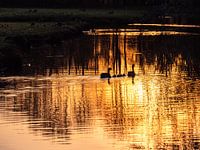 Vater und Mutter Gans schwimmen bei Sonnenaufgang im Graben.