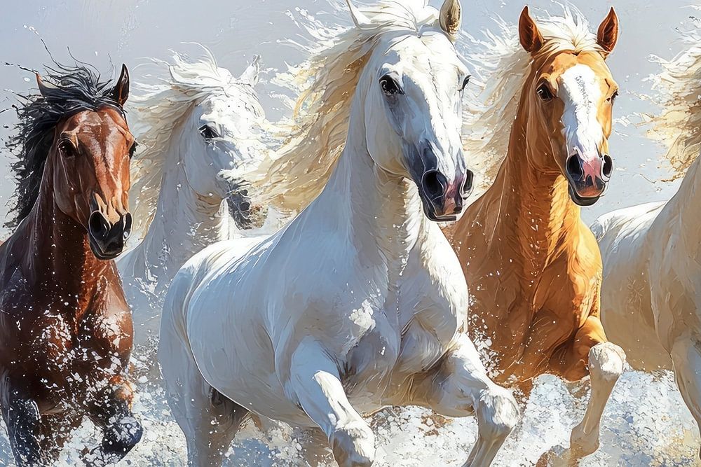 Eine atemberaubende Szene mit Pferden, die frei an der Küste entlanglaufen und mit ihren kräftigen Schritten durch die Wellen unter einem strahlenden Himmel spritzen. Dieses Kunstwerk fängt die Essenz der ungezähmten Schönheit der Natur und den Geist der Freiheit ein und ist damit eine perfekte Ergänzung für jede Kunstsammlung oder Wohnkultur. Ideal für Pferdeliebhaber und Naturfreunde gleichermaßen