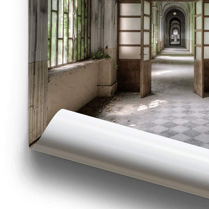 Dieser sehr beeindruckende Korridor ist Teil eines verlassenen Krankenhauses. In den Zeiten, als nicht nur Funktionalität gedacht wurde.