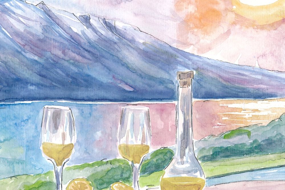 Bestelle diese Malerei Gardasee mit Limoncello und unglaublicher Aussicht auf Berge und See von Markus Bleichner als Reproduktion auf Leinwand, Alu-Dibond, als Poster, Fototapete oder Acrylglasbild.