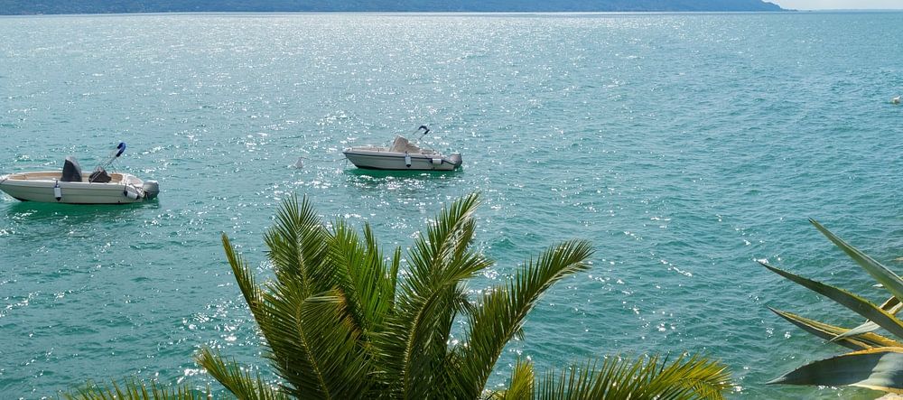 Gardasee bei Gargnano. Palmen und Agaven am Seeufer. Boote auf dem See. Landschaft in Italien.