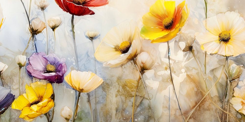 Ein farbenfrohes digitales Gemälde mit verträumten Wildgartenblumen. Das Werk verleiht Ihrem Interieur einen verträumten und klassischen Look!