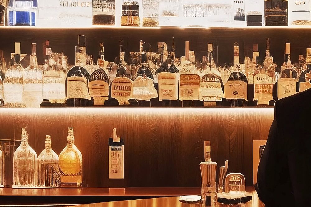 Dieses Kunstwerk fängt einen faszinierenden Moment ein: den Blick von hinten auf einen Gast, der hinter einer Bar steht. Im Vordergrund sehen wir den Gast, während im Hintergrund zahlreiche Spirituosenflaschen auf Regalen angeordnet sind. Die selektive Fokussierung lenkt unseren Blick auf die Vielfalt der Flaschen und erzeugt eine spannende Atmosphäre.