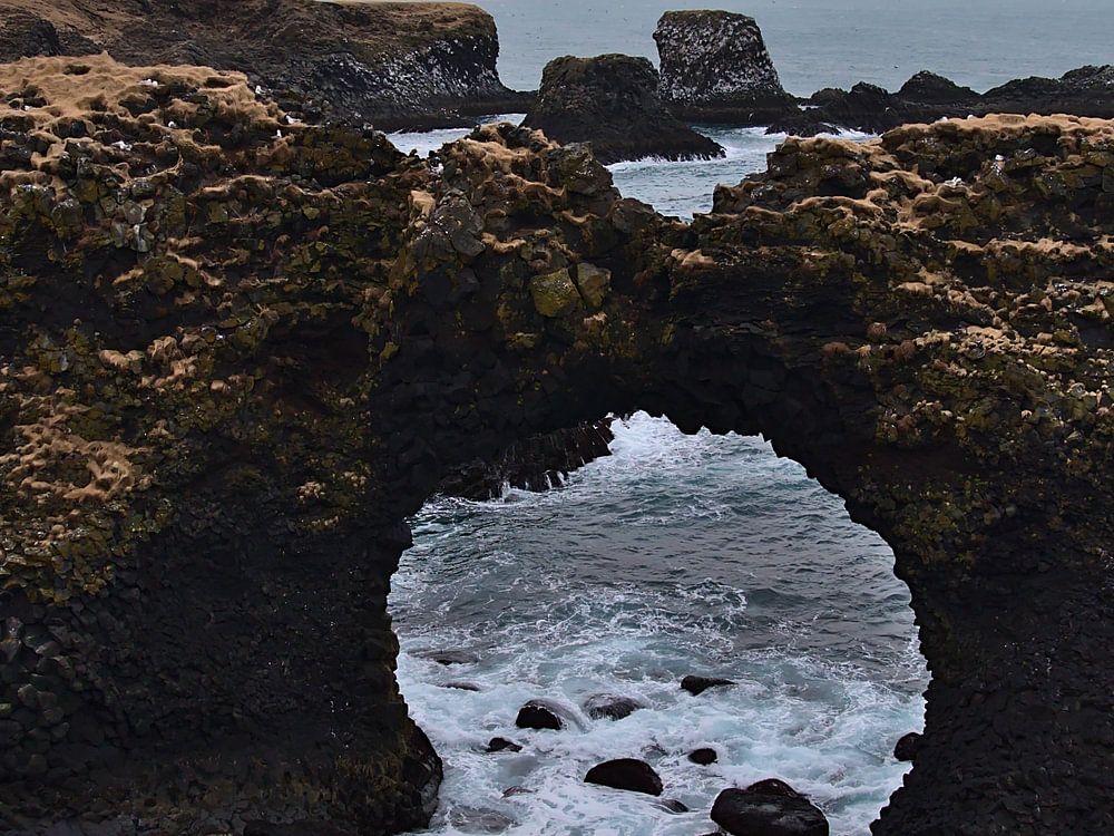 Blick auf die bizarre Felsformation Gatklettur, einen Bogen aus vulkanischem Basaltgestein, an der rauhen, felsigen Steilküste von Arnarstapi auf der Halbinsel Snæfellsnes im Westen von Island im Winter an einem wolkigen Tag.