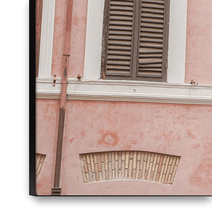 Dieses Bild zeigt Gebäude mit Fensterläden in der Stadt Rom in sanften rosa und orangefarbenen Pastelltönen.