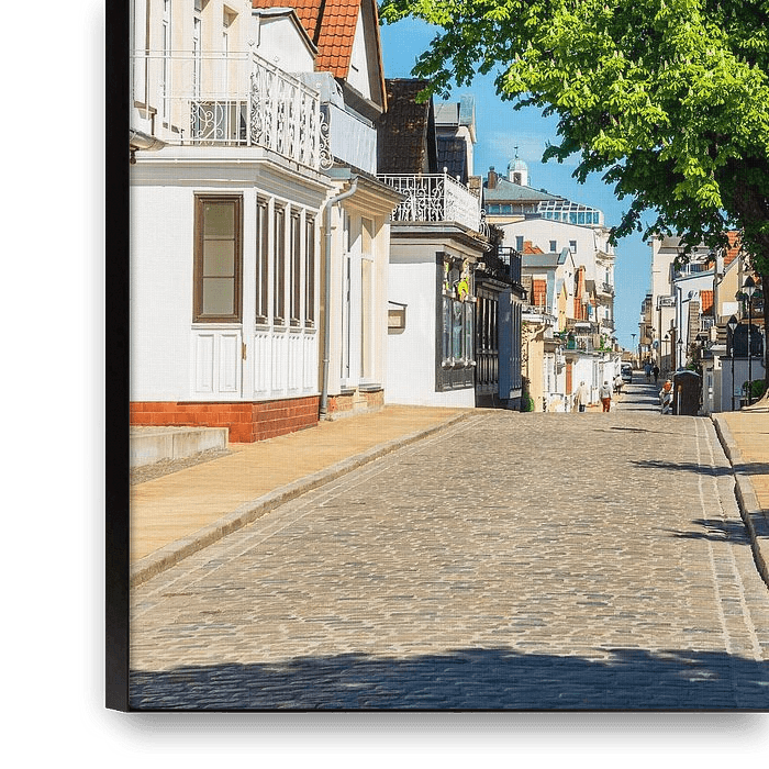Bestelle das Foto Gebäude in Warnemünde an einem sonnigen Tag von Rico Ködder als Reproduktion auf Leinwand, Alu-Dibond, als Poster, Fototapete oder Acrylglasbild.