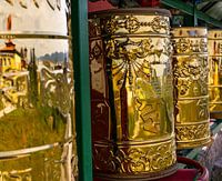 Goldfarbene und verspiegelte Gebetsrollen im buddhistischen Kloster.
