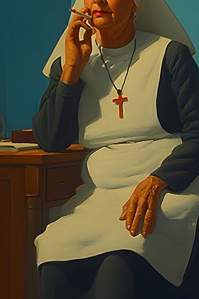 Dieses Gemälde im Stil von Edward Hopper zeigt eine Nonne sitzend und still an einem Schreibtisch. Das Nachmittagslicht zeichnet harte Linien an die blaue Wand. In der Hand eine Zigarette, der Rauch steigt langsam auf, als sei er Teil ihrer Gedanken. Ihr Blick ist fern, zwischen Pflicht und Erinnerung verloren. Der Raum ist karg, die Zeit scheint stehen geblieben – nur das Licht und der Rauch bewegen sich, leise, unaufdringlich, melancholisch.
