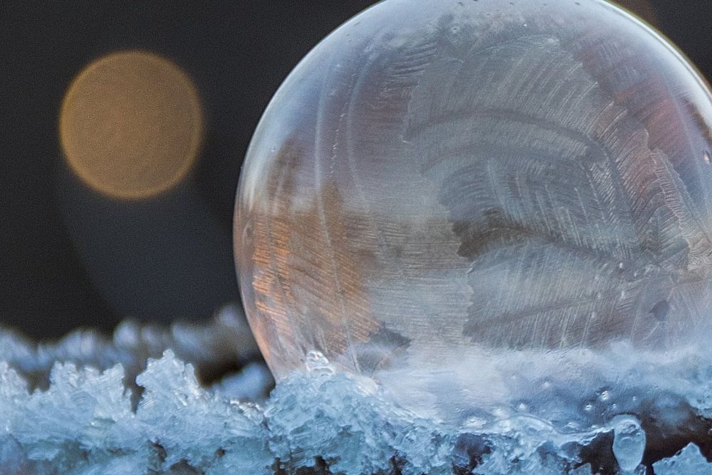 An einem kalten Wintermorgen Seifenblasen pusten, die langsam gefrieren.