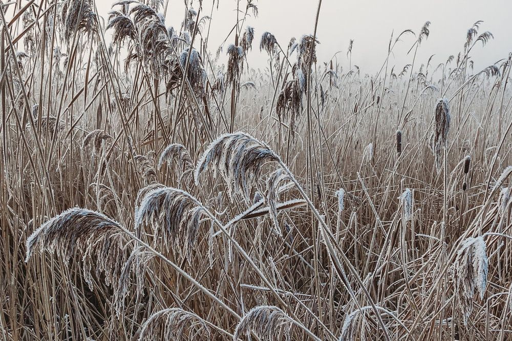 Eine Winterszene durch Nebel und Raureif. Es war ein kalter Morgen, an dem die Schilfrohrfahnen gefroren waren. Dieses Foto wurde in Zwolle, hinter dem Isala-Krankenhaus, aufgenommen.