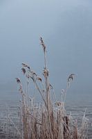 Eine Winterszene durch Nebel und Raureif. Es war ein kalter Morgen, an dem die Schilfrohrfahnen gefroren waren. Dieses Foto wurde in Zwolle, hinter dem Isala-Krankenhaus, aufgenommen.