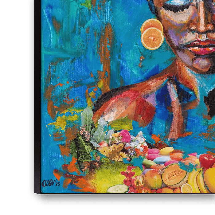 Eine farbenfrohe Mixed-Media-Arbeit, bei der ich Acrylfarbe und verschiedene Papiersorten verwendet habe, die ich mit einer fröhlichen Bilderserie hauptsächlich von Obst und etwas Gemüse kombiniert habe. Das gibt mir ein Sommergefühl.