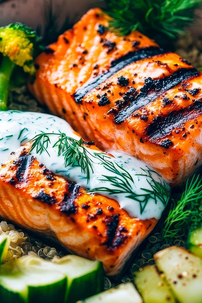 Ein verlockender Anblick, der frische Aromen zelebriert: saftig gegrillter Lachs, umhüllt von cremiger Kräutersauce, begleitet von knackigem Gemüse in lebendigen Grüntönen. Diese Komposition strahlt Vitalität und Genuss aus – perfekt für die Küche oder das Esszimmer, wo kulinarische Kunst und Gemeinschaftsgenuss im Mittelpunkt stehen.