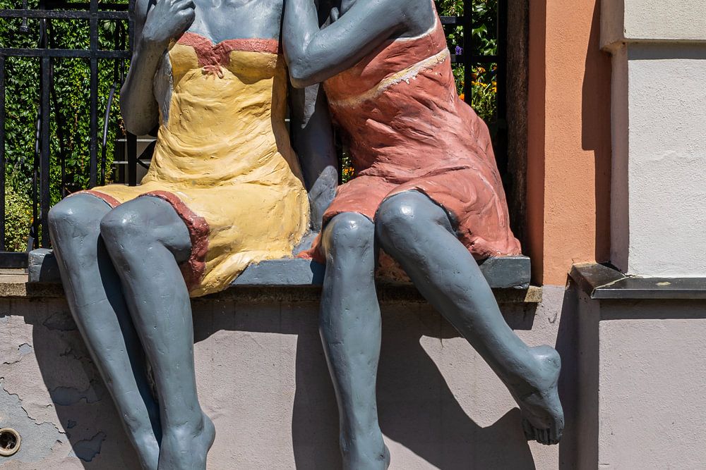 Bronzeskulptur von zwei Frauen, die in den Straßen der tschechischen Stadt Hluboká ein Geheimnis teilen. Dieses Bild wurde im Sommer 2024 aufgenommen
