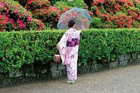 Geishas tragen einen eleganten Kimono, eine traditionelle Frisur, Sandalen und einen Sonnenschirm. Diese Frau bewundert die Farben der Azaleen Blumen (Rhododendron), Frühlingsblumen, Frühlingsblüte, romantische japanische botanische Gärten im Frühling. Die Natur erwacht in Japan, Asien.