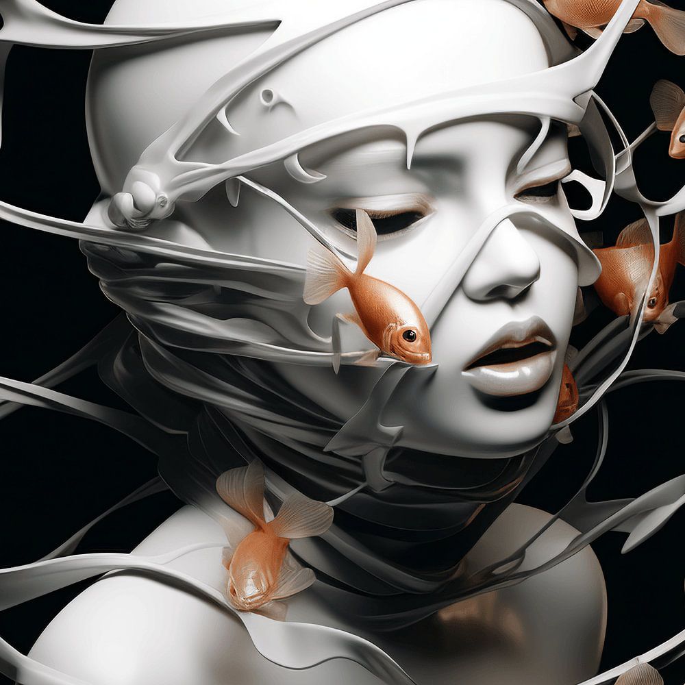 In diesem bezaubernden Werk scheint eine Frau von der ätherischen Atmosphäre einer Geisha umhüllt zu sein, ihre Haut ist weiß wie Porzellan. Um ihren Kopf winden sich geheimnisvolle Strähnen, wie tanzende Schleier, die die Grenze zwischen Realität und Traum verwischen. Zwischen diesen Fäden schwimmen leuchtende Goldfische, die wie lebende Juwelen die Szene beleben. Die Skulptur vermittelt ein Gefühl von zeitloser Gelassenheit, in der die Frau und die Fische in einem poetischen Tanz harmonisch miteinander verschmelzen.