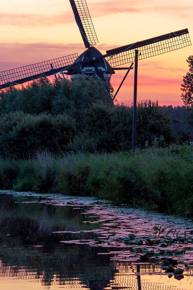 De lucht kleurt prachtig paars, roze en rood tijdens de zonsondergang van 24 juli 2014, bij Boezemmolen nr. 6 te Haastrecht.