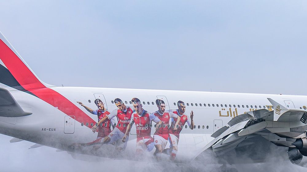 Ein Emirates Airbus A380 mit Arsenal Football Club-Aufklebern.
