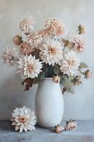 Hellrosa Dahlien entfalten sich in dem Ölgemälde als sanfte Farbschichten, die mit Sorgfalt und Geduld aufgetragen wurden. Die Blütenblätter wirken fast greifbar, ihre samtige Struktur wird durch subtile Pinselstriche und feine Farbverläufe angedeutet. Die Farbe bewegt sich zwischen zarten Rosatönen und warmen, fast pfirsichfarbenen…