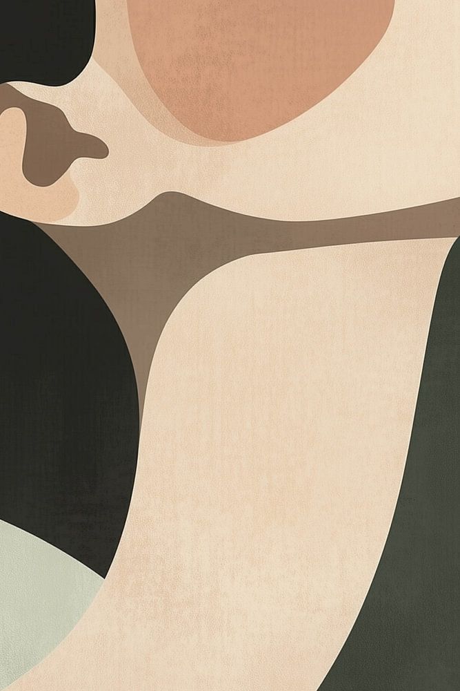 Minimalistisches und modernes Porträt einer Frau in einer verträumten, ruhigen Pose. Ihr Kopf ist nach hinten geneigt, die Augen sind geschlossen und die Lippen leicht geöffnet, was ein Gefühl der Entspannung und des Selbstbewusstseins ausstrahlt. Die Komposition besteht aus fließenden Linien und geometrischen Formen, die sich mit weichen Erdtönen wie Beige, Terrakotta, Dunkelgrün und Schwarz abwechseln.
