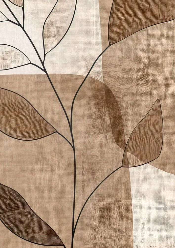 Serene Lines - Dieses abstrakte Gemälde stellt eine stilisierte Pflanze dar und konzentriert sich auf die künstlerische Verwendung von geometrischen Formen und subtilen Farbtönen. Die Komposition besteht aus einer eleganten, vereinfachten Pflanze mit dünnen schwarzen Linien, die den Stamm und die Blätter umranden. Die Blätter sind mit einem Wechsel von Braun- und Beigetönen dargestellt, die harmonisch in den Hintergrund übergehen, der aus sich überlappenden organischen Formen in tieferen Braun- und weichen Beigetönen besteht. Der Hintergrund weist eine subtile Textur auf, die an die Ästhetik von Leinwänden erinnert. Dieses minimalistische Werk nutzt geschickt den negativen Raum, um eine heitere und beruhigende Atmosphäre zu schaffen.