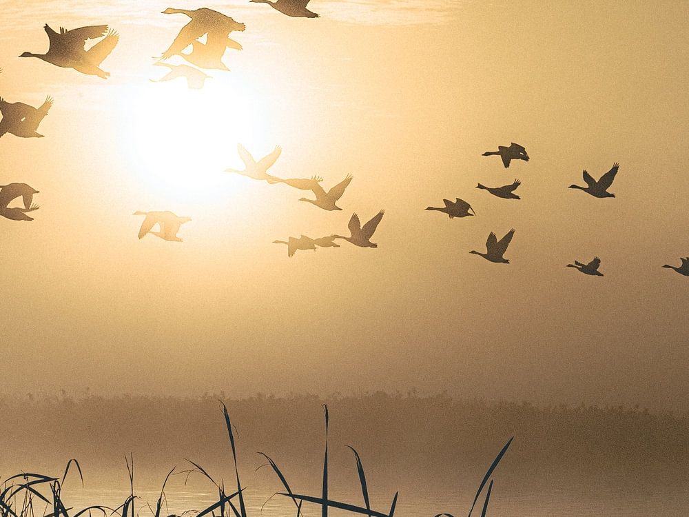 Am frühen Morgen mit einem goldgelben Horizont in Veenwouden beginnen die Gänse ihren Zug. Dieses Foto spiegelt die heitere Ruhe der Natur wider, wie wir sie bei Sonnenaufgang vorfinden.