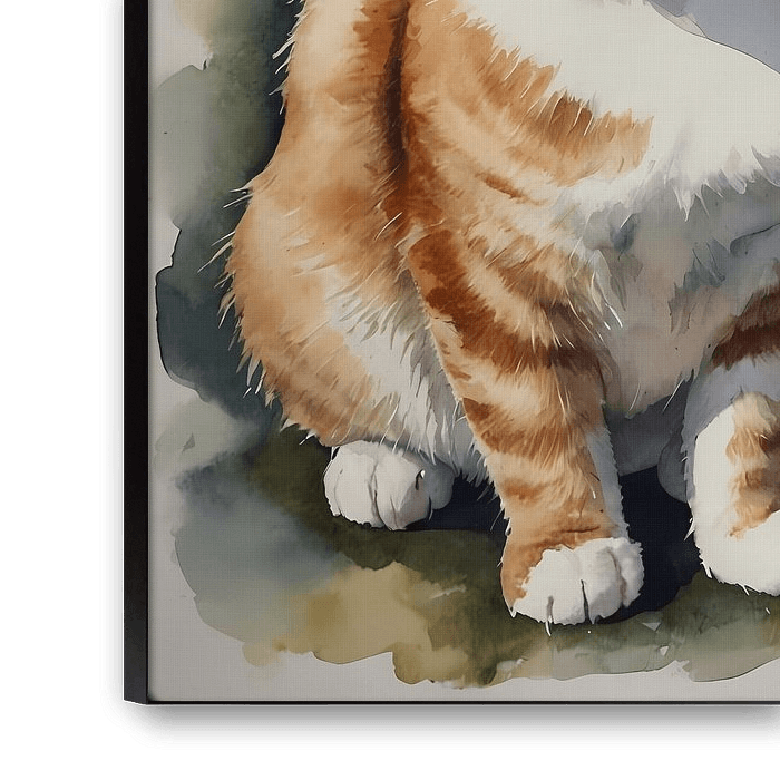 Dieses charmante Aquarell einer orange-weißen Katze wird jeden Raum in Ihrem Zuhause verschönern. Mit ihrem nachdenklichen und neugierigen Blick scheint diese Katze für jedes Abenteuer bereit zu sein, das auf sie wartet. Die leuchtend orangefarbenen Streifen und weißen Markierungen seines Fells wurden sorgfältig gemalt, so dass die Textur fast greifbar ist. Umgeben von einem weichen, verträumten Hintergrund, der in schöne Grün- und Gelbbrauntöne übergeht, bringt dieses Kunstwerk die Gelassenheit der Natur in Ihr Zuhause. Ideal für den Katzenliebhaber oder jemanden, der sein Interieur mit einem Stück ruhiger Schönheit bereichern möchte.