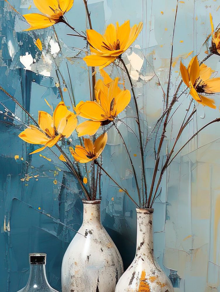 Das Gemälde zeigt zwei Vasen, die vor einem Hintergrund aus Blautönen erstrahlen. Die Vasen strahlen Lebendigkeit aus, ihre gelben Farbtöne mit orangefarbenen Schattierungen spiegeln die warmen Strahlen der Sonne wider, während das tiefe Blau die Ruhe des Himmels widerspiegelt. Die Blumen im Inneren, eine Explosion von Farben, bilden einen schönen Kontrast zum ruhigen Hintergrund und erwecken die ganze Szene zum Leben.