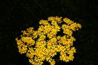 Gelbe Blumen in einer Gruppe mit schwarzem Hintergrund.