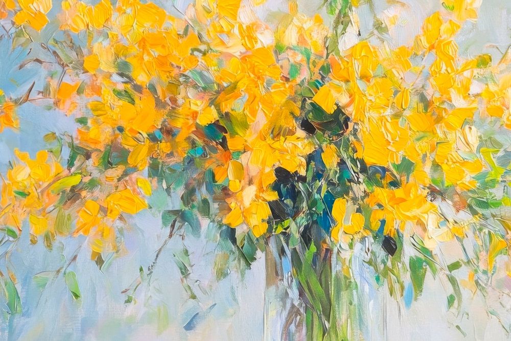Ein lebendiger Strauß aus strahlend gelben Blüten erhebt sich majestätisch in einem gläsernen Gefäß. Die sanften Pinselstriche und die harmonische Farbkombination verleihen dem Arrangement eine fröhliche Leichtigkeit, während das zarte Licht der Umgebung die Farben zum Leuchten bringt und eine einladende, frühlingshafte Atmosphäre schafft.