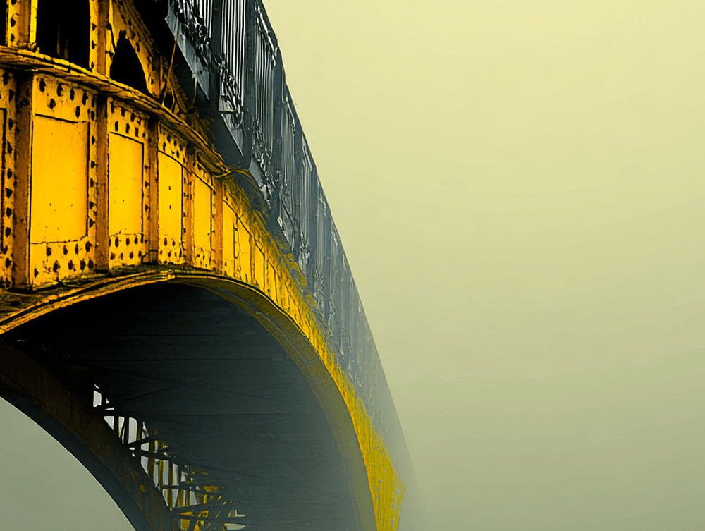 Diese heitere Landschaft zeigt eine Brücke mit leuchtend gelben Bögen, die sich sanft im Wasser spiegeln. Der neblige Hintergrund und der subtile Farbverlauf verleihen dem Werk eine ruhige und poetische Atmosphäre. Perfekt für alle, die auf der Suche nach Brückenkunst in Gelb und Blau, Wasserlandschaften und stiller visueller Ruhe sind.