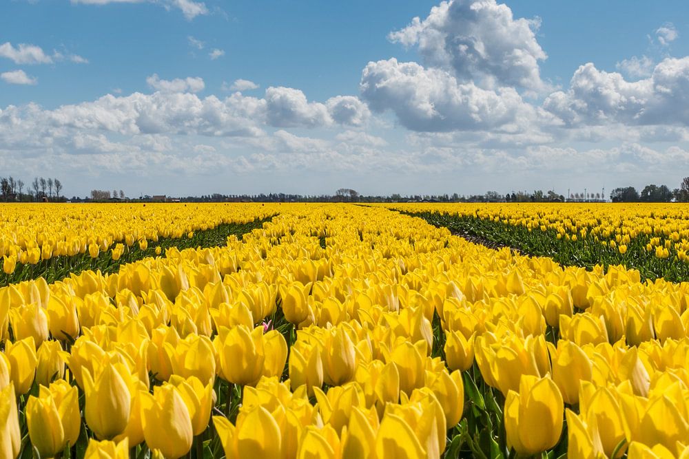 Gelbe Tulpen unter blauem Himmel mit Wolken auf die Insel Goeree Overflakkee in die Niederlande.