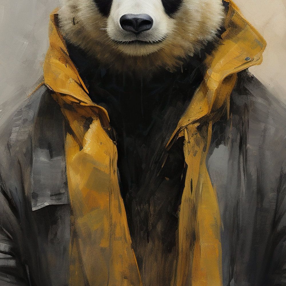 Gelber Regenmantel - Dieses faszinierende Gemälde zeigt einen riesigen Panda in einem lässig geöffneten, gelben Regenmantel vor einem weichen, fast monochromen Hintergrund. Der Stil ist realistisch mit einem Hauch von Surrealismus, während die erdigen und ockerfarbenen Töne einen warmen Kontrast zu dem Schwarz und Weiß des Pandas bilden.