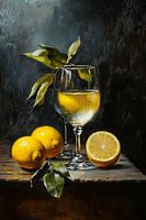 In “Gele Zomer” ontvouwt zich een levendig en tegelijk ingetogen stilleven waarin de kleur geel en het spel van licht en reflectie centraal staan. Op een sobere, donkerbruine houten tafel liggen drie citroenen: twee geheel en één doorgesneden, waarvan het sappige vruchtvlees in verfachtige nuances van geel en zachtwit straalt. De…