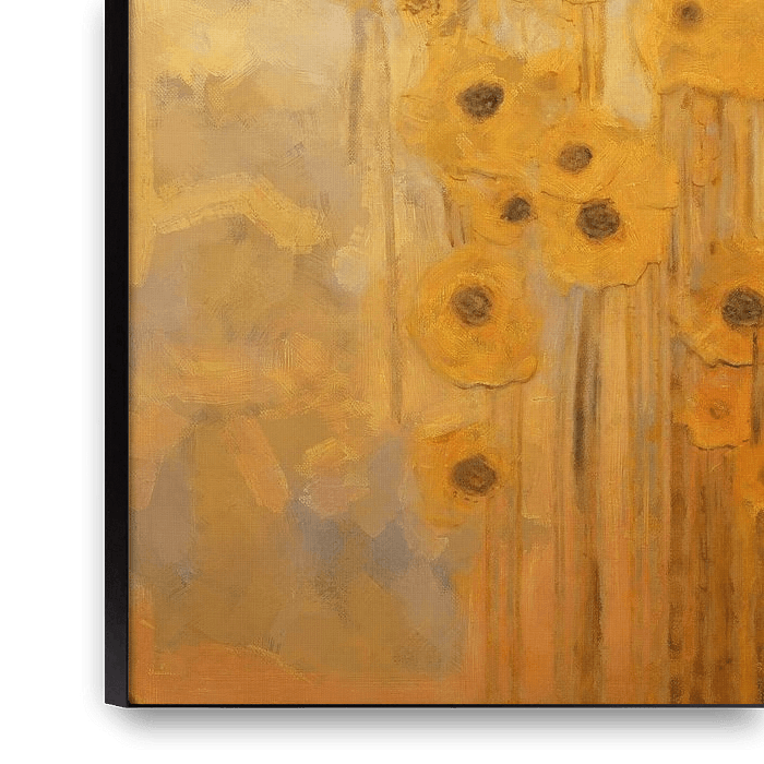 Dieses Werk strahlt mit seiner Fülle an gelben Blumen, die anmutig in verschiedene Richtungen wachsen, Wärme und Freude aus. Die Blumen scheinen auf dem sanften Hintergrund aus hellen Gelb- und Beigetönen fast zu tanzen und vermitteln ein Gefühl von Sanftheit und Heiterkeit. Die verspielte und doch ruhige Komposition macht dieses Werk…
