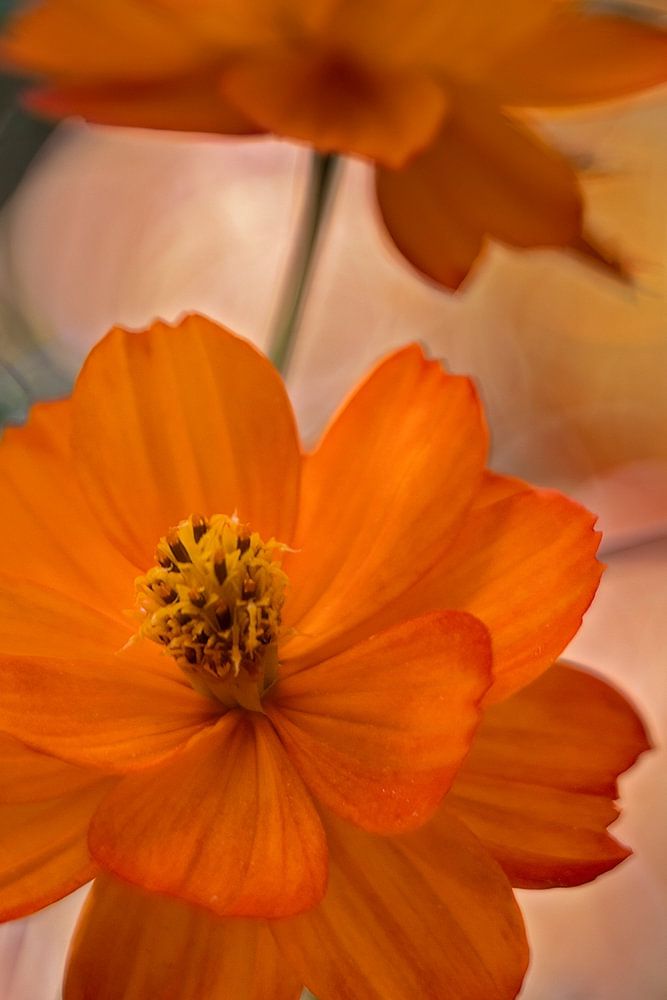 Gelbes Schmuckkörbchen fotografiert mit einem Vintage Objektiv. Eine Blüte im Fokus, Hintergrund wunderbar bunt und luftig.