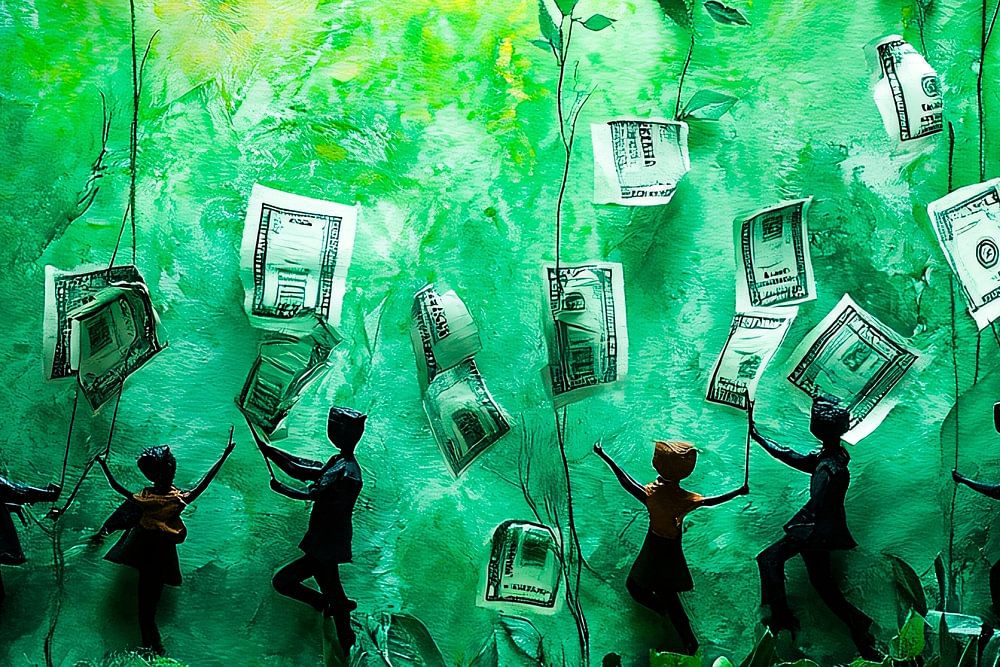 Dieses Design verbindet die Kraft der Natur und der Wirtschaft auf einzigartige Weise. In einer bezaubernden grünen Umgebung sehen wir Banknoten, die auf Ästen wachsen, wie Blätter, die Überfluss und Wohlstand symbolisieren. Unter den Bäumen bewegen sich die Silhouetten von Menschen, die in dieser Fantasiewelt spielen und tanzen. Das Spiel von Licht und Farbe erzeugt einen dynamischen Effekt, der Energie und Bewegung ausstrahlt. Dieses Kunstwerk passt perfekt in moderne Räume, wie z. B. ein Wohnzimmer oder ein Büro, wo es nicht nur visuell anregt, sondern auch zum Nachdenken über Nachhaltigkeit und Werte anregt. Ideal für alle, die kreatives und sinnvolles Design lieben.