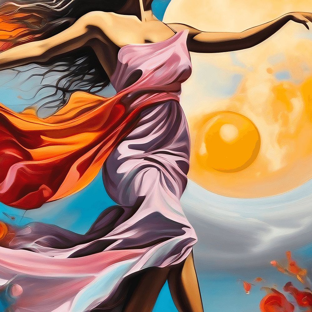 Ein schönes Gemälde, das eine tanzende Frau mit Blumen und viel Farbe darstellt.