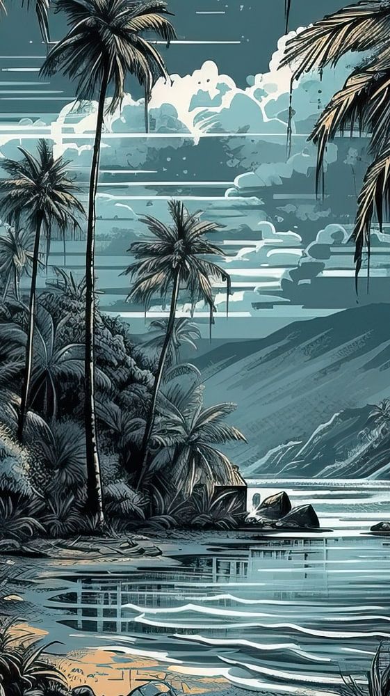 Gemälde von einem Strand mit Bergen und Bäumen im Hintergrund - Dieses Gemälde zeigt einen schönen Strand mit kristallklarem Wasser und weichem Sand. Im Hintergrund sind majestätische Berge und üppige Bäume zu sehen, die die Landschaft einrahmen. Der Stil des Gemäldes ist sehr detailliert, so dass man fast das Gefühl hat, selbst vor Ort zu sein. Dieses Kunstwerk wäre perfekt für ein Wohnzimmer mit rustikalem Flair. Es wäre eine großartige Ergänzung für einen Raum mit Holzmöbeln und Erdtönen.Was halten Sie von diesem Gemälde? Wäre es etwas, das Sie in Ihrem eigenen Zuhause haben möchten?