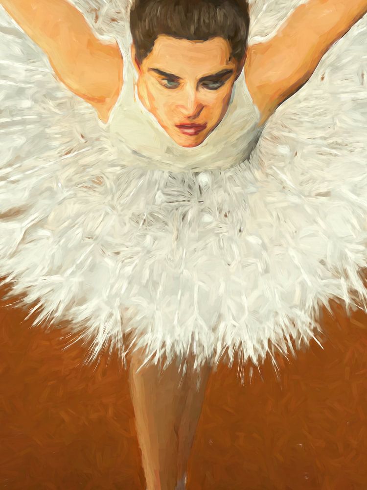 Die Farbpalette aus warmen Erdtönen wie Braun und Weiß bildet einen schönen Kontrast zum Hintergrund und unterstreicht die natürliche Schönheit der Pusteblume. Jedes Detail wurde sorgfältig gemalt, um die Textur des Tutu und die subtilen Bewegungen der Ballerina zum Leben zu erwecken.
