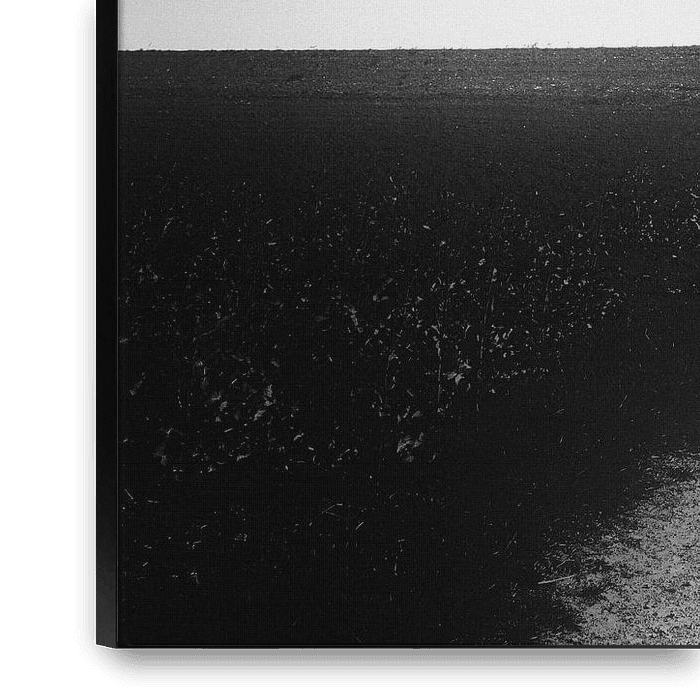 Zwei Menschen gehen am Ende eines Weges zwischen zwei Feldern. Ihre Körper erscheinen als Silhouetten am Horizont. Fine art Straßenfotografie in schwarz weiß