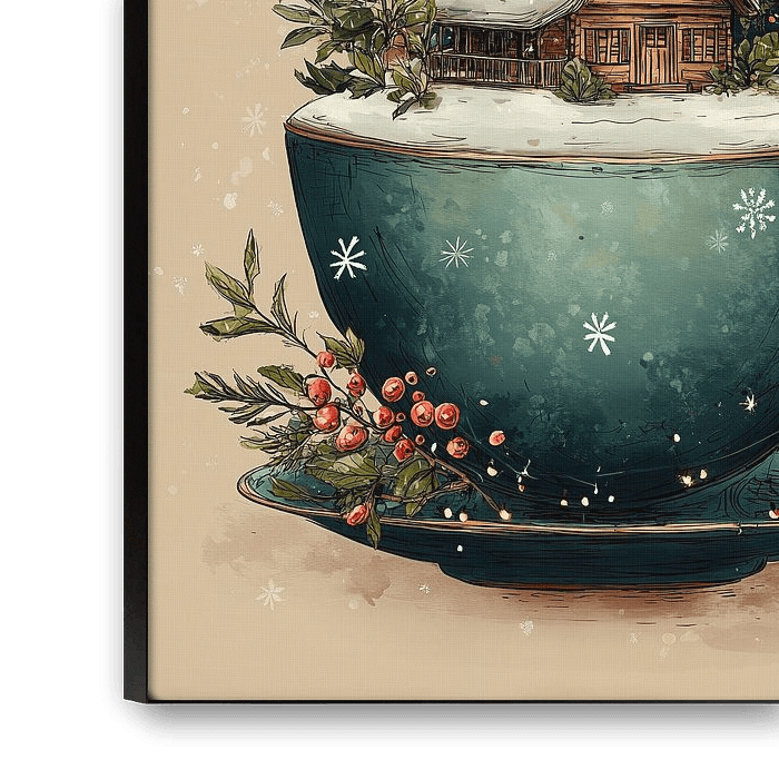 Dieses Kunstwerk vereint den nostalgischen Charme eines schneebedeckten Häuschens mit der Gemütlichkeit einer warmen Wintertee-Zeremonie. Vor einer beigefarbenen Schneelandschaft thront ein behagliches, schneebedecktes Häuschen auf einem eleganten, dunkelgrünen Hügel, umgeben von Kiefern und roten Beeren. Es spielt meisterhaft mit Maßstab und Perspektive: Das rustikale Haus im Miniaturformat erschafft eine vollständige Winterwelt – perfekt für alle, die sich nach Geborgenheit, Sicherheit und Abenteuer zugleich sehnen.