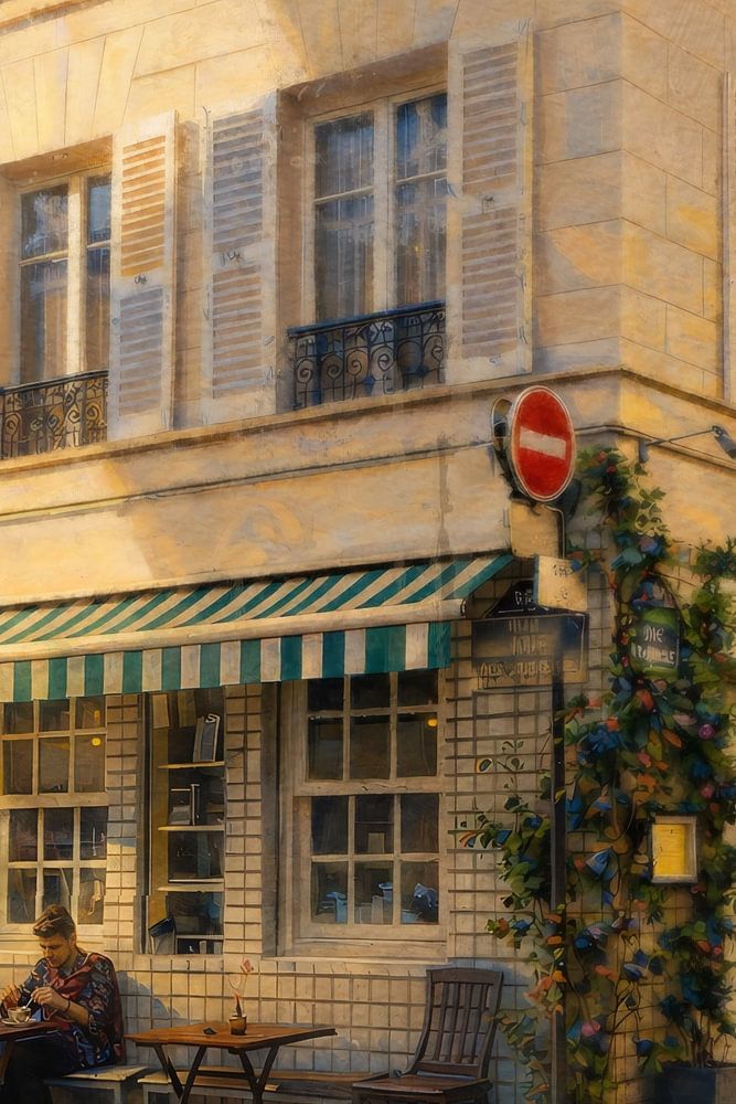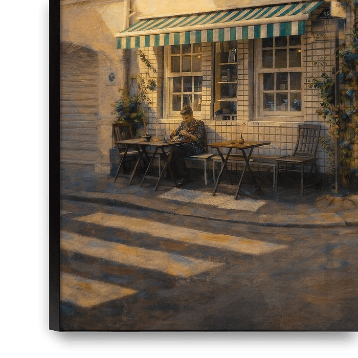 An der Ecke einer charmanten Pariser Straße gelegen, fängt dieses Gemälde die warme Atmosphäre einer gemütlichen Brasserie in Paris an einem Sommertag ein. Das sanfte Sonnenlicht gleitet über die cremefarbene Fassade, die grün-weiße Markise und die kleinen Terrassenstühle, während die Stadt langsam zum Leben erwacht. Die ruhige Ecke,…