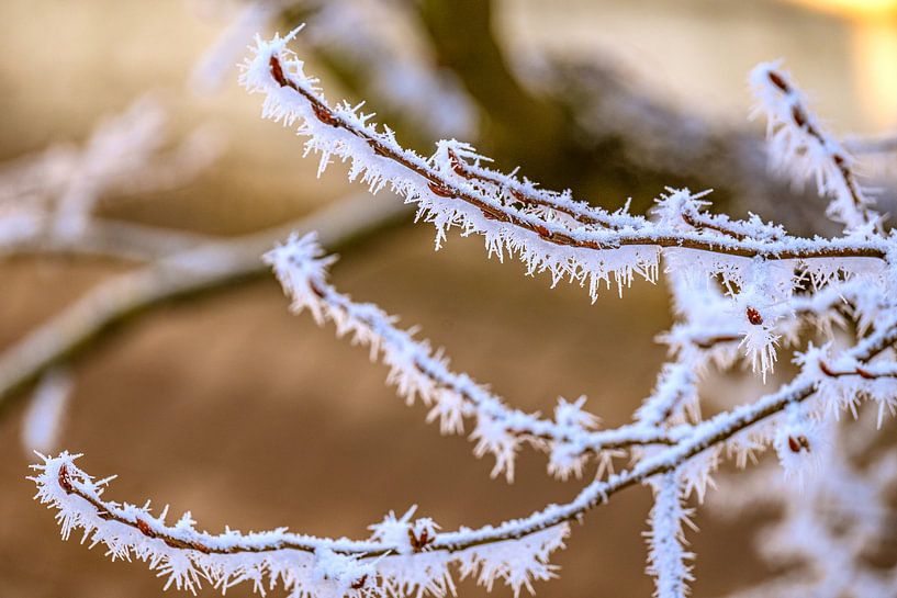 Filigraner Raureif überzieht zarte Baumzweige und verwandelt die Natur in eine glitzernde Kristallwelt. Die feinen Eiskristalle stehen im sanften Kontrast zum warmen, goldfarbenen Hintergrund, der die Ruhe eines frostigen Wintermorgens ausstrahlt.